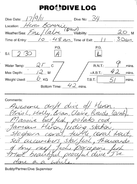 Notes: Braiden’s Bommie at Wistari Reef. Rebecca’s dive logs because I’m useless and didn’t keep any.