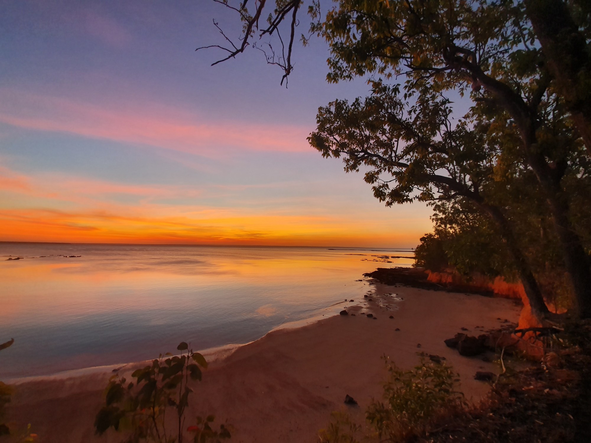 All meet up at Humpty Doo Servo early before setting off. Corey, Sarah and Arley in one car; Rod, Judy and myself in one car; and the Welsh car with Jo, Stephen and Lowri-ellen. 2 hours on the Arnhem Highway to Jabiru for last fuel stop before heading towards Coburg Peninsula. Crossed the infamous Cahills Crossing but only one little croc hanging out and then couple hours on the dirt to Wiligi Outstation. Pulled up and set up camp; couple tents and swags, the camper and some eco-tents. We joined Rueben, Liz and Aaron from Wiligi Experience for sundowners – well self invited ourselves for a drink anyway. Enjoyed the sunset and enjoyed our first night out under the stars!